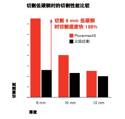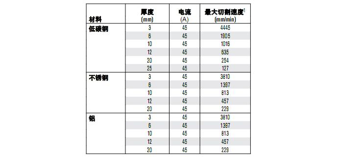 最大切割速度为 Hypertherm 实验室的测试结果。为实现最佳切割性能,实际切割速度可能会随不同的切割应用工况而变化。如需了解更多详情,请参考《操作员手册》。