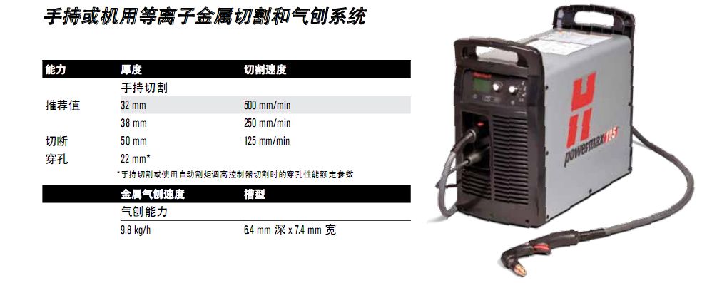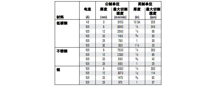最大切割速度系根据 Hypertherm 实验室测试所得的结果。为实现最佳切割性能,实际切割速度可能会随不同的切割应用而有所不同。有关更多详情,请参考《操作手册》。